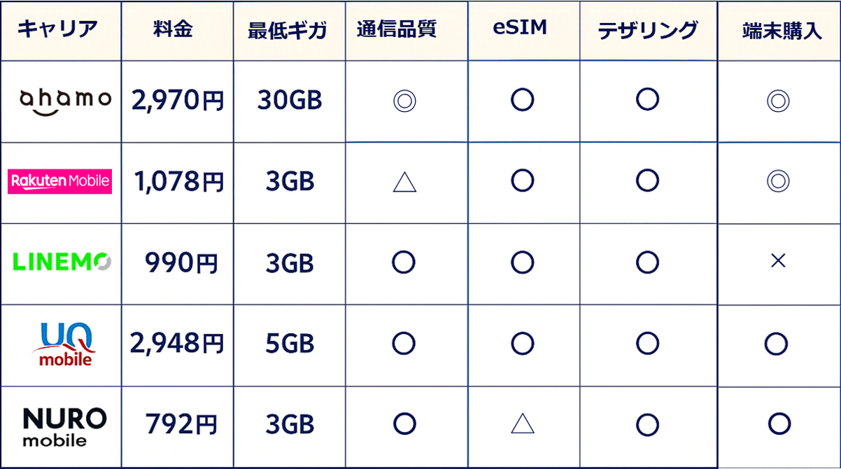 | 最低ギガ | 3GB | 3GB | 5GB | 3GB | |